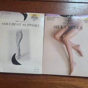 They are vintage, size short. Both are of the Sheer Caress line from J.C. Penney. One is Sheerest support, control top, durable silky leg, and reinforced toe. The other one is Satin Control top, silky sheer leg and reinforced toe.
