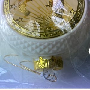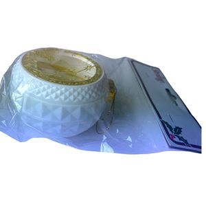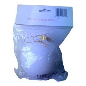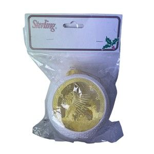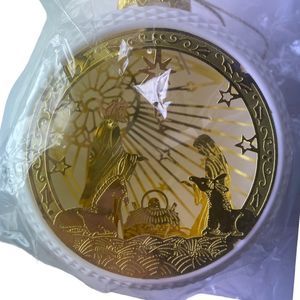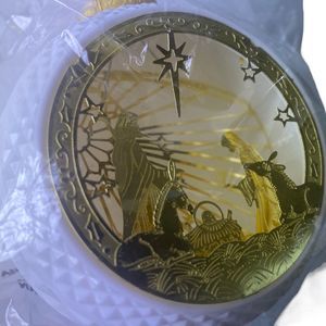Sealed in original package. Unique Christmas Ball with a Dimensional gold Nativity Scene The ball itself is plastic but looks like white cut milk glass the bottom has a place to put a Christmas string light into for ultimate lighted effect and this hole also allows for the natural light to enter to give it a reflective shiny glow Approximately 3.25 high
