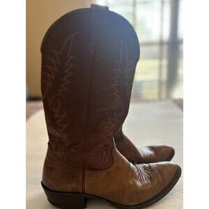 These vintage Nacona cowboy boots, crafted from premium bullhide leather, feature an almond toe shape, pull-on closure, and a solid pattern that exudes classic western charm. Size 8