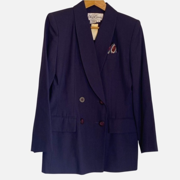 Command attention with this stunning vintage 80s / 90s, Oleg Cassini blazer—new old stock (NOS) with original tags still attached. Crafted in a deep navy blue, this structured, double-breasted blazer features a shawl collar, padded shoulders, and sharp tailoring that channels classic '80s power dressing. A bold, printed pocket square is tucked into the chest pocket for an extra pop of character—authentic vintage flair that nods to Cassini’s legacy of confident, elegant style.