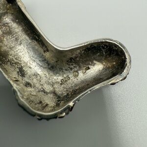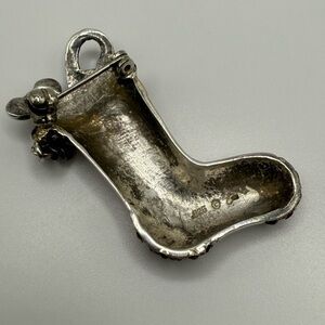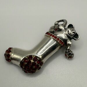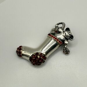 Charming silver brooch shaped like a Christmas stocking. Features red accents and a cute mouse detail.