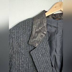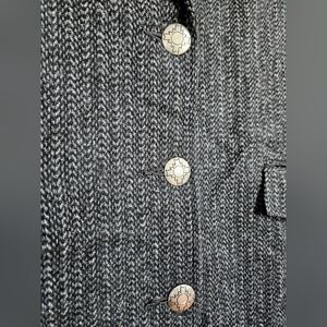 This vintage Pioneer Wear jacket is a must-have for any fashion-forward woman. The tooled leather collar provides a sophisticated Western style, while the softshell fabric type ensures comfort and durability. The charcoal gray color and long sleeves make it a versatile piece for any occasion, and the silver button medallions give it a classic southwestern touch.