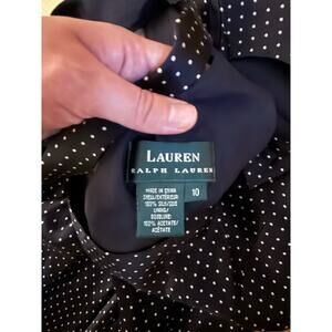 The product is a vintage new with tags Ralph Lauren polka dot swing criss cross dress in black silk size 10. This A-Line dress is designed for women and features a classic polka dot pattern, making it a stylish and versatile addition to any wardrobe. The criss cross detailing adds a touch of sophistication, while the silk material ensures a luxurious feel and shine. Perfect for a variety of occasions, this dress combines timeless elegance with modern style.