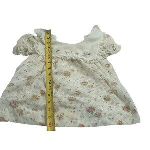 The dress is made of a lightweight polyester blend material and has an empire waist with a fit and flare style. It has a button closure at the back and a collarless neckline. This knee-length dress is perfect for summer, fall, or spring season and is available in size 6-9 months. The dress also has accents like ruffle and button details, making it a perfect holiday or 80s themed dress for your little fashionista. Measurements photographed. See pictures, please. Ships quickly (TBD14)