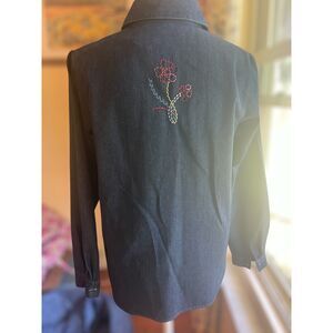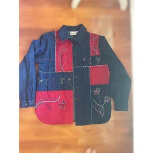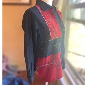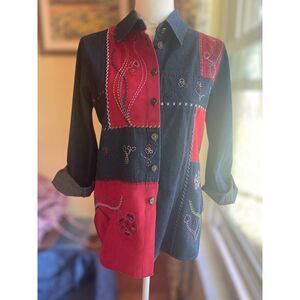Unique shirt featuring red suede patchwork along with colorful floral and cross stitch embroidered design