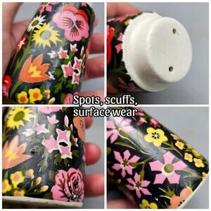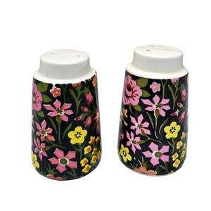 Matching Salt & Pepper Shakers. Multicolor: Pink, yellow, red, white, green flower print painted on black background. Issues noted in photos. Good preowned condition, overall C-7681 by Napcoware Japan.