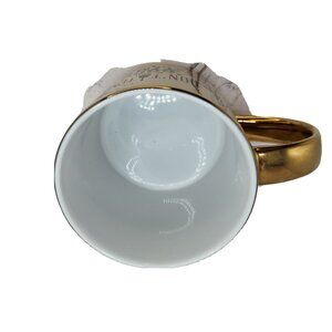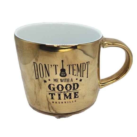 This vintage Nashville Country 'Don't Temp Me With Good Time' Guitar Golden Coffee Mug is a medium-sized stoneware mug featuring a gilded design of a guitar, fitting for all occasions. Manufactured in 1999, this collectible piece is styled in a Country Music theme, with painted details and a large capacity for hot or cold beverages. With a handle for easy use, this mug embodies a nostalgic country music vibe from the 1990s, making it a unique addition to any collection for music enthusiasts and fans of vintage memorabilia.