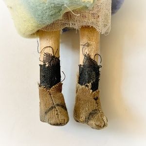 Painted face, black hair, pale yellow and pale blue blanket, straw stuffed body and wooden dowel legs.