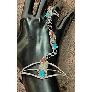 VTG Native American Slave Cuff Bracelet Ring Coral Turquoise on Sterling Silver