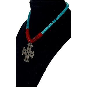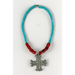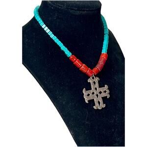 VTG Native American Turquoise & Red Coral Cross Necklace Sterling Silver Pendant