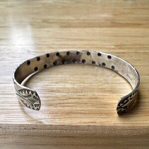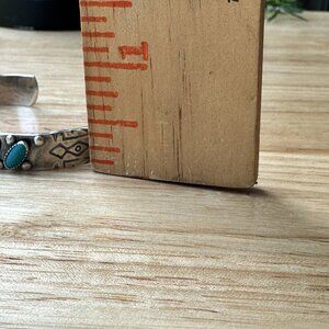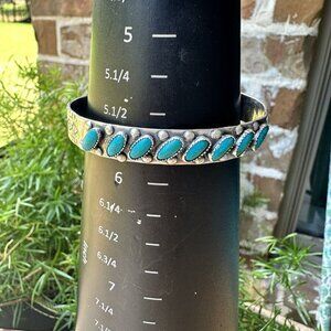 This vintage Navajo cuff bracelet is a true piece of artistry. Handcrafted with sterling silver, it features seven beautiful turquoise stones that are sure to catch the eye. This Navajo Native American bracelet is size 5.75 with an open cuff allowing for some minor adjustment with natural blue turquoise stone cabochons handset into serrated bezels, the bracelet is adorned with feathered arrows, sterling raindrop or pearl accent beads, and geometric trail symbols. It is in good pre owned clean condition with remnant artisan tooling marks, minor use wear, touch of tarnish, has all original stones in great shape, no issues collector investor quality vintage old pawn. Please review pictures for more details and size measurement information, thank you.