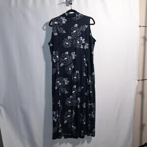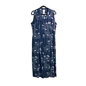 VTG Navy Blue Floral Linen Blend Shirt Dress 90s Mom Button Up Boho Preppy 16 * White stag white flowers sleeveless collared full button down button up academia breathable spring summer classic vintage 80s 90s retro whimsigoth AOP all over print fairy