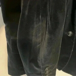 THIS IS VINTAGE SIZING PLEASE CAREFULLY REVIEW THE MEASUREMENTS. Navy 100% cotton velvet blazer. Puff sleeves. Very good vintage condition. Some wear marks along the shoulder and lower sleeves-please see photos.