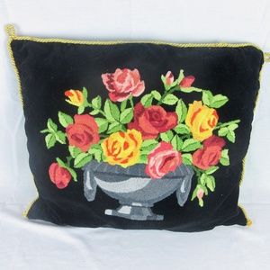 Vintage Mid Century 1950's 1960's throw pillow handmade from midnight black velvet and wool fabric. Punch needle embroidery in glorious colors feature a bouquet of roses in an urn.