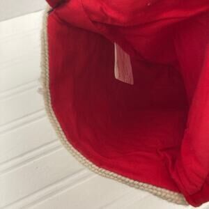 VTG Needlepoint Christmas Wool Stocking Red Velvet Backing Seasons Greetings Bow