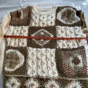 This vintage wool sweater showcases an intricate patchwork design in earthy tones, offering warmth and style in cooler months. Its unique texture and quality craftsmanship make it a stylish choice.