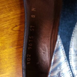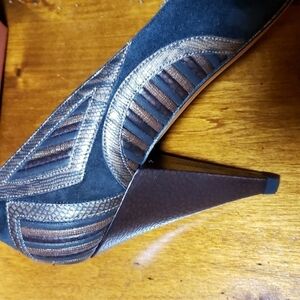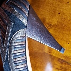 Black suede with copper color reptile embossed leather heels and patches on the side.