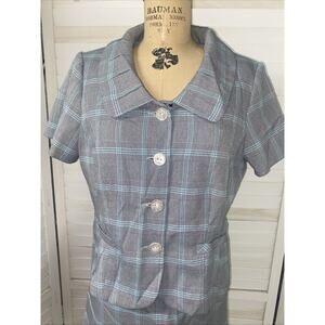 Short sleeve blazer top. 4 buttons up the front. Tapered. Collared with pleats. Lightweight shoulder pads.