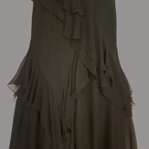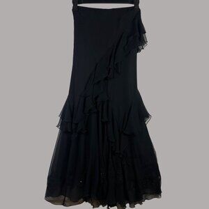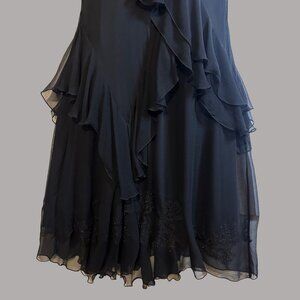 This strapless dress from Newport News features a ruffled, intricate embroidery & beading. Made with a luxurious silk overlay, it's an elegant choice for many occasions. Size M but very stretchy.