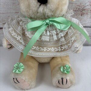 Plush Bear with straw hate, lace top, green ribbons, eye glasses