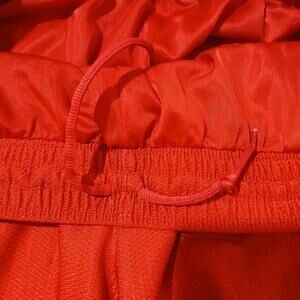 The product is a pair of vintage Nike basketball shorts for men in medium size, featuring a solid red color with a shiny dazzle finish. These shorts have a relaxed fit with a drawstring closure for a comfortable and adjustable waist. Made of polyester blended fabric, they offer stretch and flexibility for ease of movement during sports activities like basketball. With 9-inch inseam and pockets, these athletic shorts are ideal for all seasons and occasions where active wear is needed. The retro design and iconic Nike branding make them a stylish and functional addition to any wardrobe.