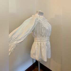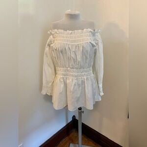Vintage early 2000s 90s NINETY brand 100% cotton soft bright white off shoulder long sleeve blouse! Very flirty boho peasant top, with stitching and rouched waist, elastic around waist and top.