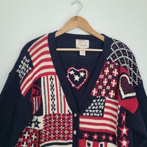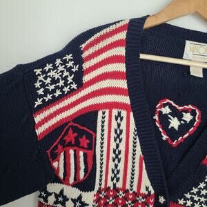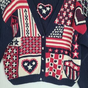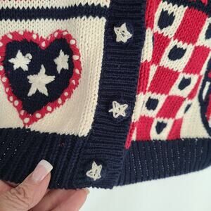 Vtg Ninon de Lenclos Cardigan Sweater sz L Red White Blue Flag Hearts Patriotic