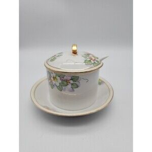 Nippon Hand Painted Sugar Bowl with Attached Under Plate and Spoon Floral Design. This dish is in exceptional condition considering age and use. The gold on the handle shows a little wear. There is a small defect on the under-dish rim and inside the rim of the dish. They do not appear to be chips. It is quite lovely! Item is sold as is. Measurements are inside the photos. Please ask all questions prior to purchase.