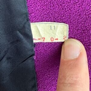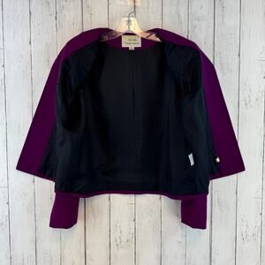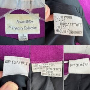 Details: 100% wool, 100% acetate lining, purple with black beaded embellishments, open front jacket, midi pencil skirt with back zipper and button closure, dry clean.