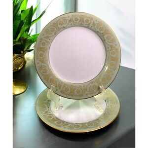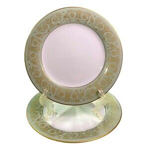 VTG Noritake Viscount 6845 Salad Plates Green & Gold Scroll 8 1/4" Set Of 2 MCM