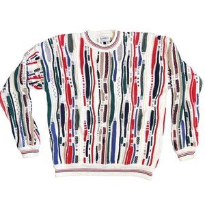 VTG North Wales 3D Textured Coogi Like Crew Neck Sweater L White Colorful Knit