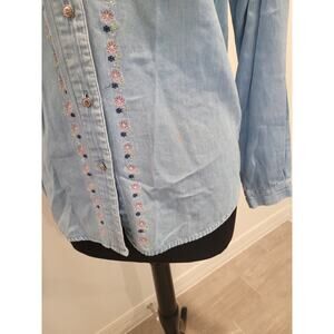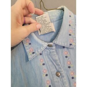 Embrace cozy vintage charm with this Vintage Northern Reflections women's chambray shirt, featuring delicate embroidered details on soft blue denim-like cotton. A timeless button-down perfect for casual wear, layering, or cottagecore-inspired outfits.
