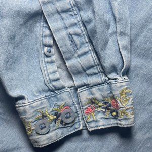 Features: Embroidery on collar, pocket and cuffs. Embroidery contains a boat scene, birds and flowers