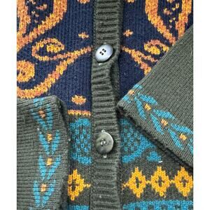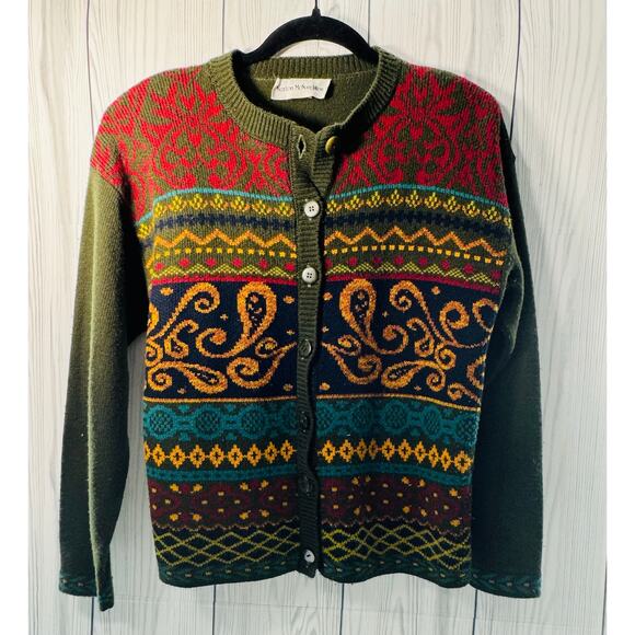 VTG Norton McNaughton Olive Green Mixed Print Knit Cardigan Sweater USA Small