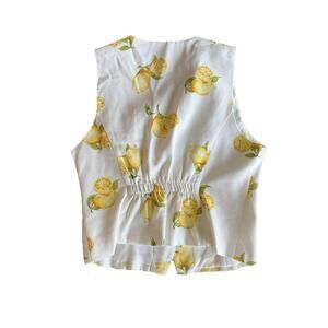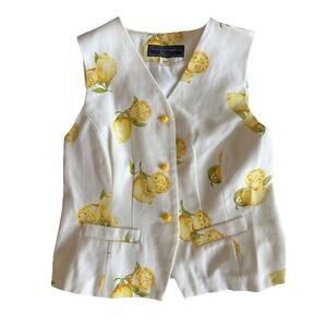 white and yellow vest with lemons design and buttons. Even the buttons are shaped like lemons.