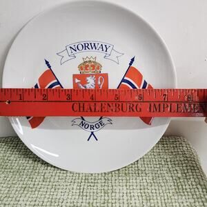 Porcelain plate (approx. 7.5” diameter): Features the Norwegian coat of arms with dual flags and the word Norge. Glossy white finish with a metal hanger attached to the back.