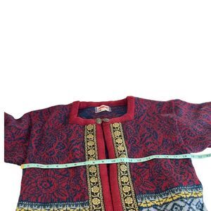 Authentic vintage Norwear Norwegian wool cardigan sweater featuring a traditional Nordic folk design. Crafted in pure wool with intricate woven patterns in red, black, green, yellow, metallic gold, and blue. Boxy, cozy fit with ornate trim details. A timeless piece that blends heritage craftsmanship with everyday wear.