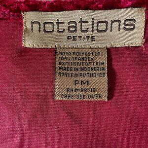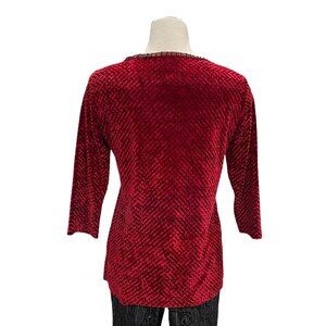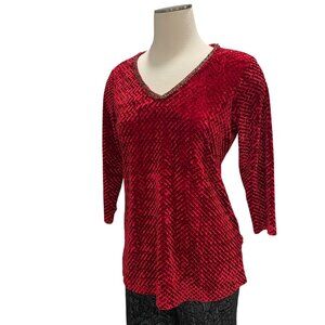red velvet top, holiday party wear, festive fashion, elegant top, sequin trim, textured velvet, evening wear, luxe texture, petite medium, sparkle trim, holiday outfit, 3/4 sleeve top, deep red blouse, winter fashion, Notations Petite top, special occasion blouse, holiday sparkle, Christmas party top, V-neck blouse, luxurious velvet, stretchy top, comfortable party wear, classic holiday fashion, petite clothing, formal event top, statement top, glamorous look, fall and winter style, office to evening blouse