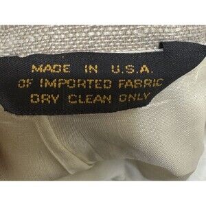 This is an Oakton Ltd vintage beige textured 2 buttons blazer jacket coat in size 46L, designed for big and tall men. The blazer is made from a blend of polyester, viscose, and linen materials, featuring a long jacket/coat length and a classic blazer style. The fabric type we giving it a unique touch. The blazer is a vintage piece, adding a nostalgic flair to its overall look and appeal.