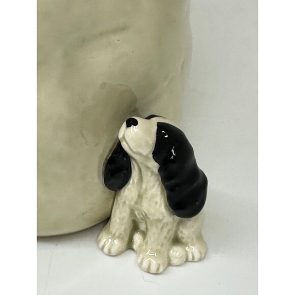 Charming vintage OMC Otagiri ceramic snowman cookie jar featuring a black-and-white spaniel dog. A festive collectible perfect for holiday décor or candy storage.