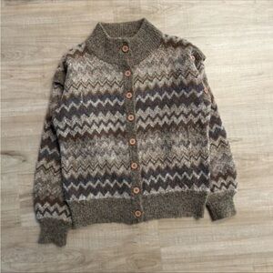 excellent preowned condition. Incredible design- the sleeves are removable and you can turn this into a vest. 100% acrylic but feels like wool to the touch. Machine washable.