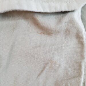 Very good used condition. No flaws or excess wear noted. There are 2 minor spots on the left chest pocket as shown. Tons of pockets, cotton, vented back, front zip. Very cool piece!