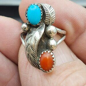 Up for sale is a vintage old pawn sterling silver ring. Beautiful turquoise and coral cabochons bezel set in silver with a leaf and small balls on it.