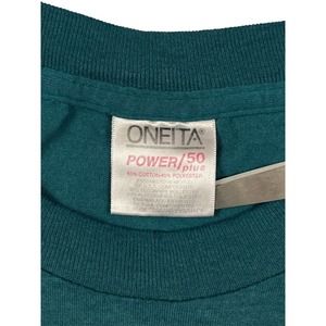 This vintage Oneita T-shirt is a must-have for any outdoor enthusiast. The forest green color and embroidered accents on the chest make it a great addition to any collection. Made from a comfortable blend of polyester and cotton, this collared shirt is perfect for all seasons and features short sleeves and a regular fit for a classic look.