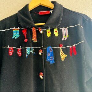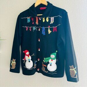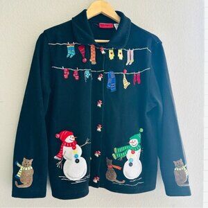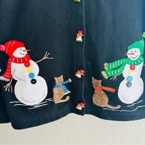 Charming black cardigan with snowman and cat design. Perfect for holiday cheer.