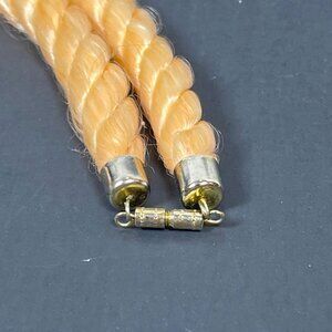 This 1980's vintage necklace features a vibrant pastel peach and purple tiger lily enamel flower pendant on a twisted peach cord. Its bold design and quality craftsmanship make it a standout accessory.