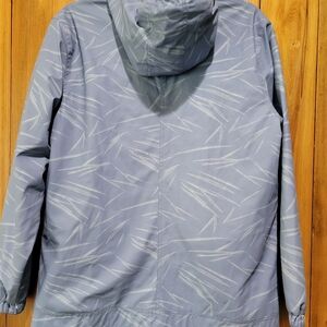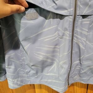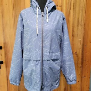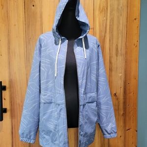Stylish blue hooded windbreaker jacket with a subtle pattern. Perfect for casual outings.