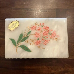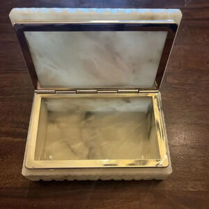 This vintage trinket box from Orvieto Import Corp is a beautiful addition to any collection. Made in Italy, it features a white marble design with a marbled pattern and a polished finish. The box is small, rectangular in shape, and comes with a hinged lid.