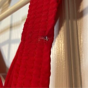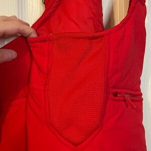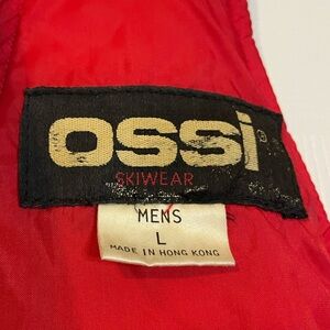Vintage Ossi Skiwear red bib ski pants with adjustable suspenders, front zipper enclosure, stretchy side panels zipper enclosed pocket and inner lining in pant legs to keep snow out.