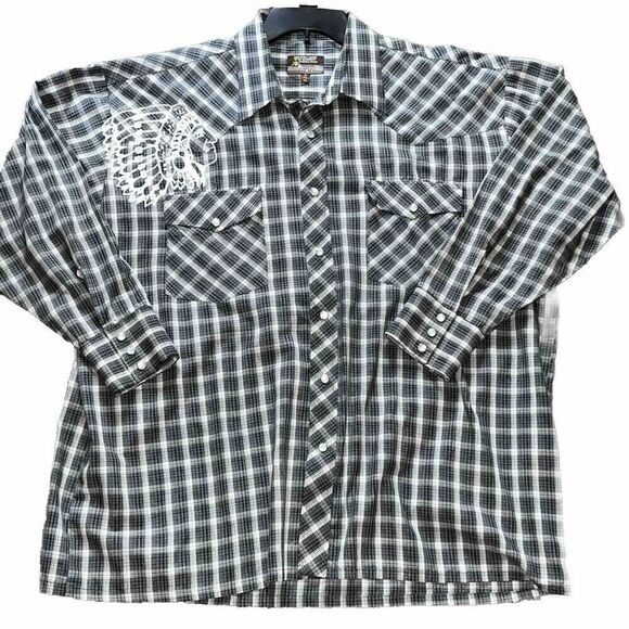 VTG Outlaw Western Wear Mens Shirt Size 1X Big Plaid Chief Stencil Pearl Snap
